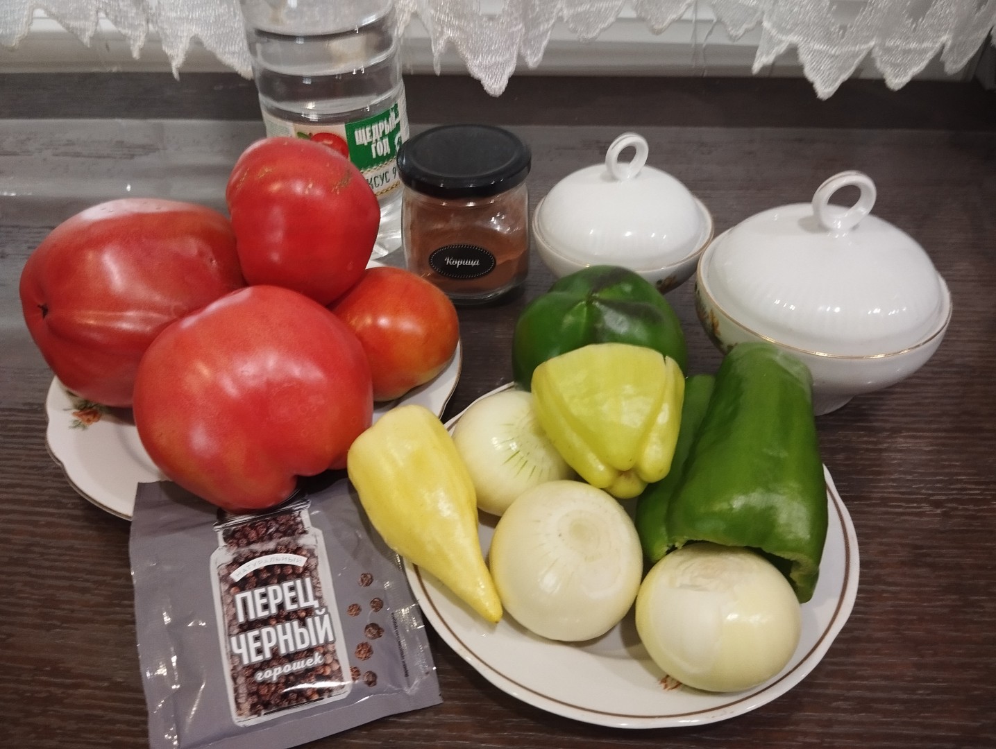 Калорийность продуктов: Помидоры, Лук репчатый, Болгарский перец, Соль, Корица, Перец красный молотый, Душистый перец, Перец горошком, Сахар, Уксус