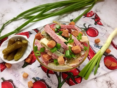 Для праздничного стола выбрала рецепт салата с фасолью кириешками и колбасой. Это очень вкусный и сытный салат! Благодаря своему составу он особенно хорошо сочетается с горячительными напитками.