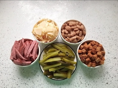 У меня была белая консервированная фасоль. Такую фасоль я всегда промываю кипяченой водой, чтобы смыть рассол. Колбасу взяла полукопченую, главное, что она вкусная. Огурчики маринованные, в них чувствуется уксус (иногда очень хочется именно таких). Кириешки со вкусом салями, мне кажется, они отлично гармонируют с остальными ингредиентами. Сыр у меня голландский, натерла его ломтиками. А колбасу и огурчики нарезала брусочками.