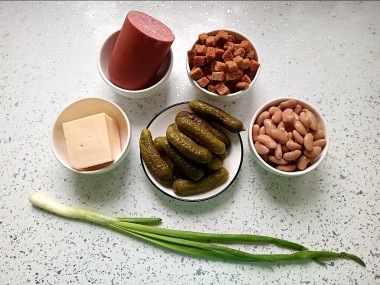 Как сделать салат с фасолью, кириешками и колбасой? Подготовьте следующие продукты: колбасу (можно использовать при этом любую колбасу: копченую, вареную, ветчину или сосиски/шпикачки), кириешки - логичнее взять со вкусом и ароматом бекона/ветчины/колбасы - какие найдутся в вашем доступе, или же взять нейтральный вкус кириешек. Добавьте фасоль (о ней подробнее ниже), соленые или маринованные огурцы, твердый сыр, зелень и майонез.