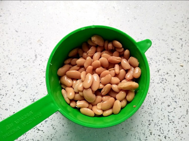 Еще один обязательный компонент этого салата - фасоль, я ее специально сварила заранее, можно взять консервированную фасоль из банки, слив с нее жидкость. Фасоль может быть как белая, так и цветная.