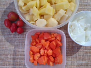Картошку порезала некрупным кубиком, лук порезала полукольцами и ещё на пополам, морковку - так же.