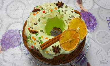 На новогодних праздниках решила испечь рождественский кекс с мандаринами в духовке. Подготовила ингредиенты по списку, замешала тесто. В моей духовке кекс выпекался около часа, готовность проверяла деревянной шпажкой. Кекс получился достаточно румяным и очень ароматным! Глазурь сделала из яичных белков и сахарной пудры, для цвета добавила капельку зеленого красителя, и лимонный сок для кислинки. Украсила кекс сушенными апельсинами, палочкой корицы, звездочками бадьяна, орехами и цукатами. Всей семье и нашим гостям кекс понравился! Спасибо за рецепт!