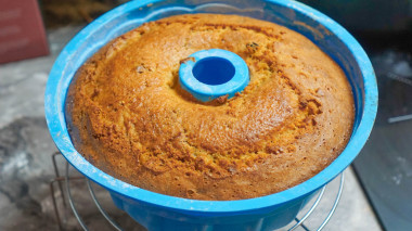 Выпекайте кекс в заранее разогретой до 170С духовке 50-55 минут. Время выпечки будет зависеть от особенностей работы духовки. Готовность кекса проверьте деревянной шпажкой. Она должна выходить из середины кекса сухой, без следов теста. Если верх хорошо зарумянился, но внутри кекс еще не пропекся, прикройте форму слоем фольги. Готовый кекс немного отсудите и извлеките из формы.