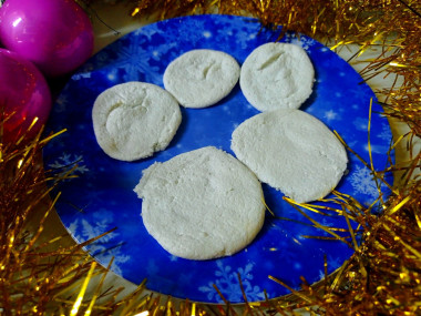 С помощью обычной ложки или венчика (можете воспользоваться блендером или миксером для ускорения процесса) разотрите ингредиенты до получения густой белой и однородной массы. Если она получится такой густой, что ее можно взять в руки, то можете скатать руками небольшие шарики одинакового размера — заготовки безе. Если масса получилась не очень густая, то заготовки безе сформируйте с помощью кондитерского шприца или выложите ее ложкой на пергамент.