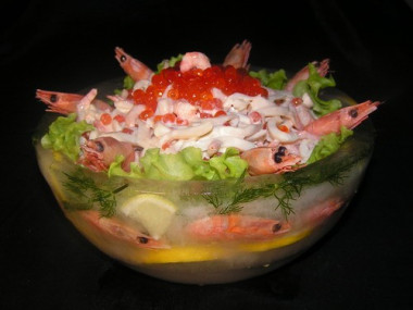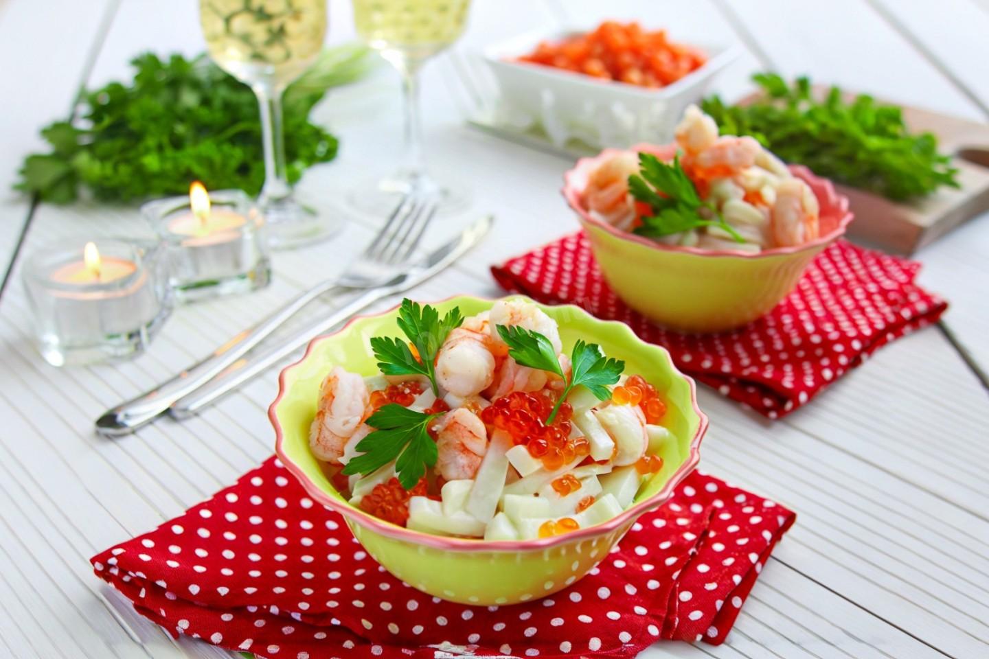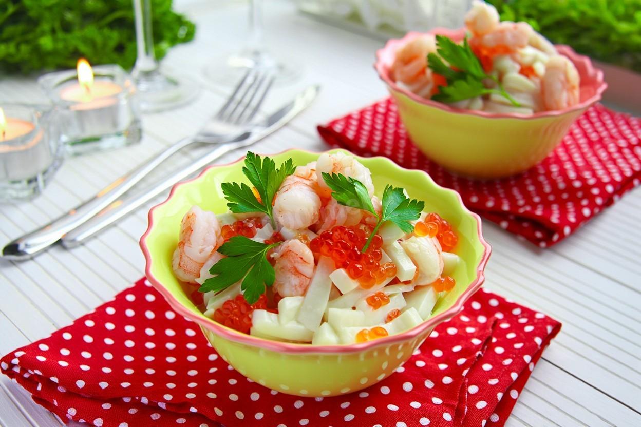 Обязательно попробуйте этот великолепный рецепт! Необычный салат кальмары креветки красная икра. Это роскошный салат для особо торжественных случаев: мы с мужем готовили его на второй день нашей свадьбы. Среди гостей это блюдо пользовалось огромным успехом! Большое спасибо за рецепт!