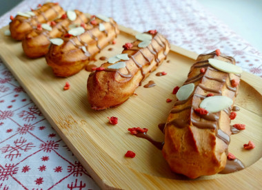 Эклеры надрежьте сбоку острым ножом. Крем переложите в кондитерский мешок. Наполните эклеры кремом с помощью мешка. Готово! Приятного аппетита!