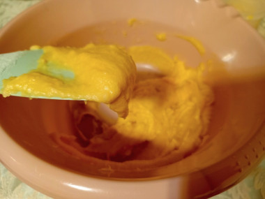 Дайте тесту немного остыть. Начните по одному вбивать в него яйца. После каждого яйца интенсивно перемешивайте тесто. Сначала оно будет распадаться на части, но потом станет однородным. Я размешивала лопаткой, можно это делать миксером.