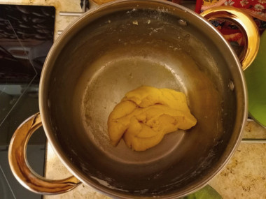 Высыпьте в ковш всю муку и сразу начните интенсивно мешать ее лопаткой, заваривая таким образом тесто. С огня посуду не убирайте, только убавьте огонь до минимума. Держите тесто на огне в течении 2-3 минут, все время работая лопаткой. Когда тесто скатается в шар, выключите нагрев и уберите кастрюлю с плиты.