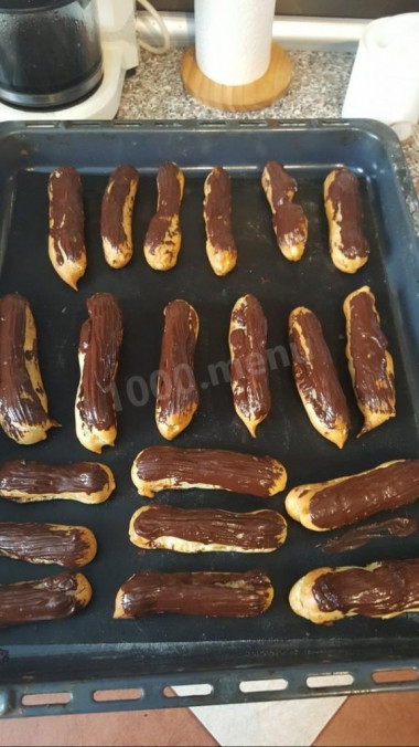 Половину порции я покрыла сахарной глазурью с какао. Но всем больше понравились эклеры без нее. Крем очень сладкий, глазурь явно лишняя.