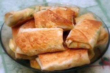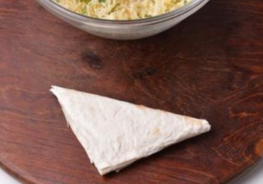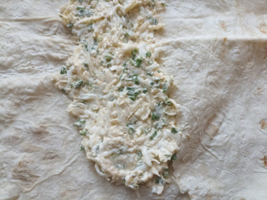 Разверните тонкий лаваш и разрежьте его на одинаковые квадраты или прямоугольники небольшого размера. В центр каждого куска лаваша выложите столовой ложкой немного начинки. Сверните лаваш конвертиком. Делать это нужно аккуратно, так, чтобы он при жарке не развернулся, и сыр не вытек на сковороду. Если лаваш кажется сухим, и есть риск того, что при сворачивании он может треснуть на сгибах, смажьте лаваш майонезом, чтобы он стал эластичнее и мягче.