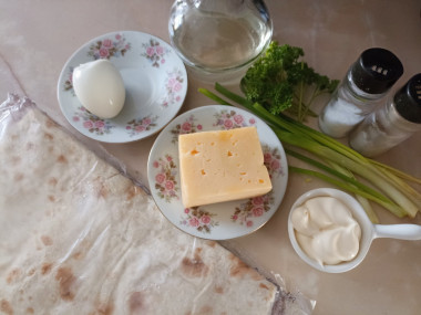 Как пожарить лаваш на сковороде с сыром и яйцом в домашних условиях? Подготовьте необходимые ингредиенты по списку. Сыр выбирайте любого сорта по вкусу и наличию; главное, чтобы он хорошо плавился при нагреве. Яйца заранее отварите в вкрутую в подсоленной воде.Готовые яйца залейте холодной водой для того, чтобы остудить их. Остывшие яйца очистите от скорлупы и натрите их на тёрке либо мелко нарежьте.