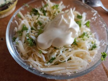 В глубокую миску сложите измельченные яйца, сыр и лук, добавьте майонез и сметану и всё тщательно перемешайте, чтобы начинка стала однородной по консистенции.