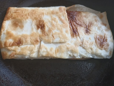 На сковороде разогрейте растительное масло и выложите на него конвертики из лаваша. Обжаривайте их по пять минут с обеих сторон, чтобы сыр внутри начал плавиться, а лаваш сверху немного зарумянился.