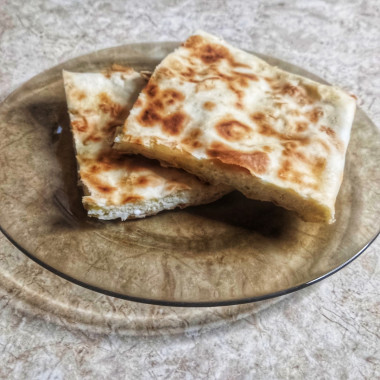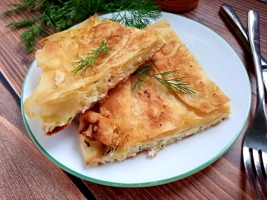 Получился целый слоеный пирог, похожий на хачапури! Очень вкусный! Сверху хрустящая корочка, внутри сочная начинка! Рекомендую!