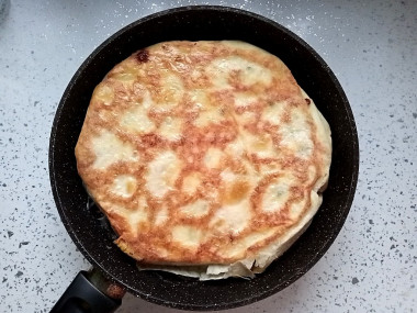 Жарьте лаваш с начинкой с одной стороны около 2-3 минут на среднем огне, когда низ лепешки начнет покрываться румяной корочкой, аккуратно переверните его лопаткой и продолжайте жарить с другой стороны до румяной корочки.