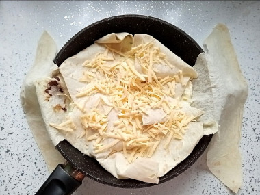 В сковороде разогрела сливочное масло, разложила лаваш, вылила начинку и разровняла, чтобы получился круг. Концы лаваша надрезала и сложила сверху. Под них еще немного сыра посыпала, чтобы он скрепил лаваш, да и начинки больше получается.