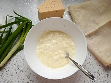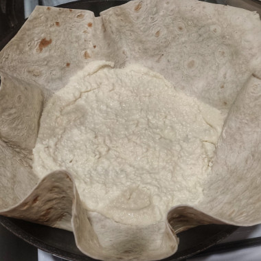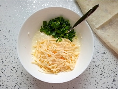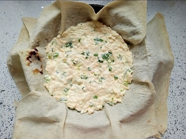 Лаваш у меня был прямоугольный, я его не обрезала, просто сложила концы сверху. У меня оставалось немного творога, смешала его с яйцами и от себя добавила зеленый лук и кусочек твердого сыра.