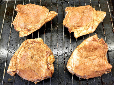 Выложите подготовленную корейку на кости на решетку, а снизу подставьте противень, для стекания жидкости и жира. Поставьте в духовку, предварительно разогретую до 210 градусов, на 40-45 минут. Ориентируйтесь по своей духовке.