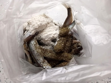 Сложите рыбу в пакет и всыпьте следом кукурузную муку. Хорошо встряхните его, чтобы мойва полностью покрылась мукой.