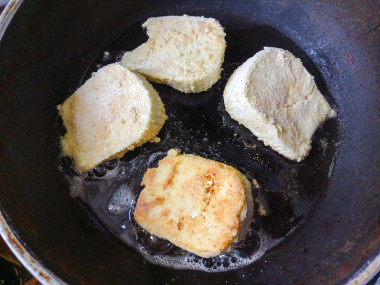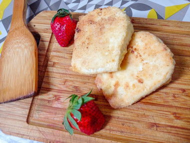 Сыр я использовала адыгейский. Купила примерно одну четвертую часть от целой сырной головки (330 граммов). Панировочных сухарей у меня не было, заменила их манкой. Обжаривала кусочки сыра примерно по 2 минуты с каждой стороны.