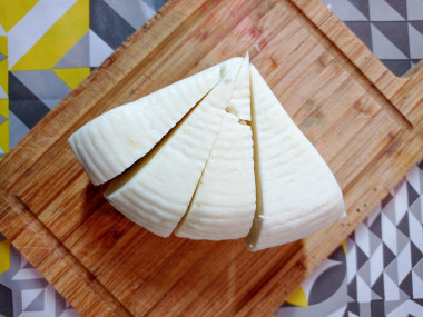 Затем разрезать сыр на восемь частей. Можно оставить и так, и приступить к дальнейшей обвалке и жарке, но я решила сделать кусочки ещё тоньше.