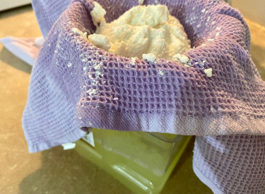 Если вы любите нежный и влажный творожок, то оставьте его в дуршлаге на полчаса. Для получения более сухого продукта отвесьте творог, как это сделала я. Связала концы салфетки и подвесила ее на ложке над кастрюлей. Сыворотку, которая будет стекать в обоих случаях, не выливайте, ее можно использовать для приготовления других блюд — блинов, теста или напитков.