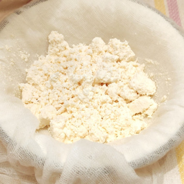 Начала варить кефир смешанный с молоком 2:1, все строго по рецепту, варю и думаю, что ничего не выйдет, не получается. Выключаю огонь, жду 10-15 минут и смотрю, что всё получилось! Процедила, слегка отжала, так как сухой не хочу(автор пишет в рецепте, как сделать сухой, если кто любит).