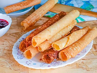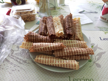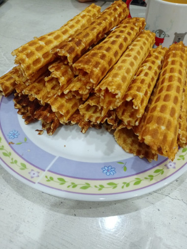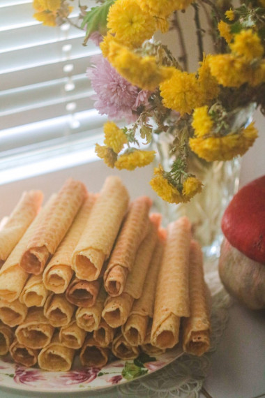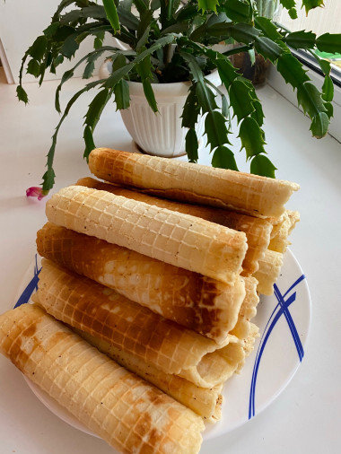 Готовила вафли в специальной форме на плите на огне чуть ниже среднего примерно по 30-40 секунда с каждой стороны. Вафельки получились тоненькие, как лист бумаги. Не прилипали к форме. Горячие вафли сразу скручивала трубочкой.