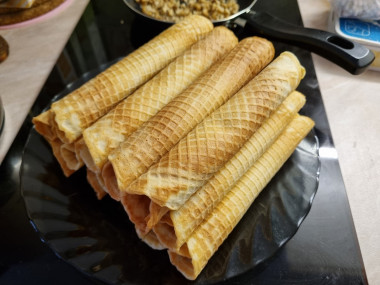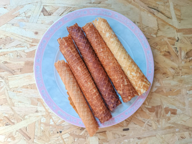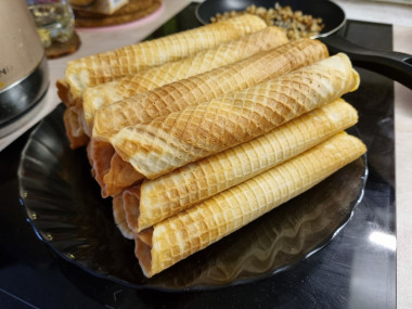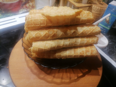 Вафли можно наполнить кремом, например, из вареной сгущенки и сливочного масла. Это, конечно, для особых сладкоежек). Тогда вафли можно скручивать также конусом. От крема вафли станут мягкими.