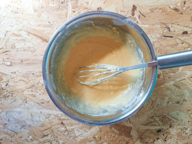 Слегка теплое сливочное масло влейте в яично-сахарную смесь. Хорошо перемешайте.
