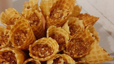 Вафли можно наполнить кремом, например, из вареной сгущенки и сливочного масла. Это, конечно, для особых сладкоежек). Тогда вафли можно скручивать также конусом. От крема вафли станут мягкими.