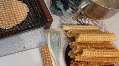 Готовую вафлю снимите лопаткой, положите на стол и сразу сверните. Здесь медлить нельзя, так как вафля мгновенно остывает и потом ее уже невозможно будет скрутить.