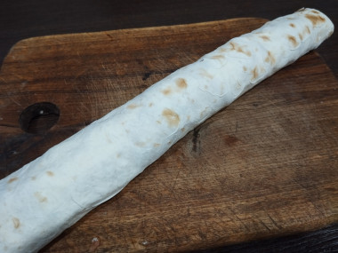 Аккуратно, подогнув край, сверните весь лаваш с начинкой в плотный рулет. Заверните рулет с рыбой и плавленым сливочным сыром в пищевую плёнку и уберите в холодильник на час, если времени мало, то можно убрать в морозилку на 20 минут.