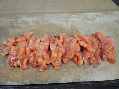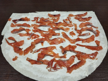 Рыбу извлеките из упаковки, пинцетом уберите мелкие кости. Острым ножом срежьте мякоть рыбы со шкурки и нарежьте на небольшие кусочки. Равномерно на небольшом расстоянии друг от друга разложите кусочки красной рыбы по лавашу.