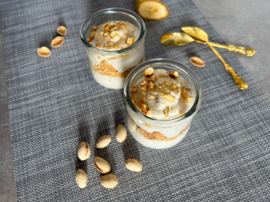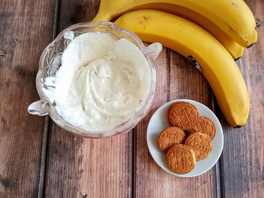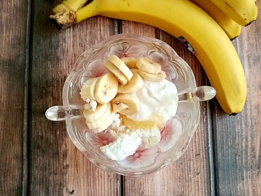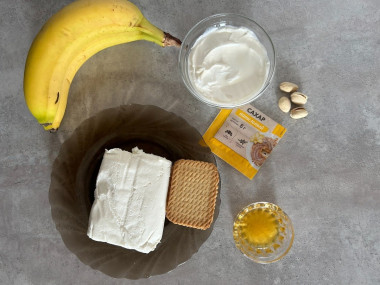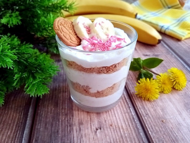 Захотелось какого-нибудь быстрого десерта. Решила приготовить творог с бананом. Все пропорции брала как в рецепте из расчета на 2 порции. Взбила в блендере сначала бананы, потом добавила сметану, творог и мед, для аромата добавила ванильный сахар, еще раз взбила. Получась очень нежная и кремовая масса. Разложила по стаканчикам с прослойкой из печенья (которое поломала руками) и нарезанных бананов. Сверху украсила крошкой печенья и фисташками (очистила и измельчила ножом), так как грецкого ореха у меня не оказалось. Чтобы охладить поставила в холодильник на 30 минут. Десерт получился очень легким, нежным и воздушным. Спасибо за рецепт.