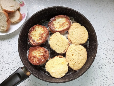 Кусочки багета сильно не замачивала, только быстро окунала в яичную смесь. Иначе хлеб может раскиснуть на сковороде.