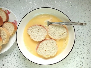 Каждый ломтик батона обмакните в яичную смесь с двух сторон.