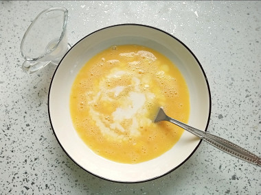 Затем влейте совсем немного, буквально, пару ложек молока. Перемешайте все с помощью венчика или вилки до однородности, чтобы появились небольшие пузырьки. Таким образом, смесь насытится воздухом.