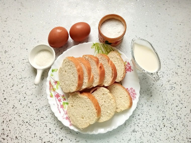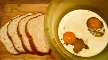 У меня был вчерашний багет, нарезала его шайбочками толщиной 1 см. Молока не было, поэтому заменила на сливки 10%. Смешала их с разболтаными яйцами, сахаром и солью.