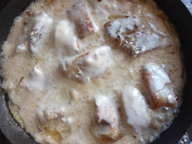 На заключительном этапе добавляем в сковороду сметану и тушим рыбу еще в течение 15-20 минут на среднем огне.