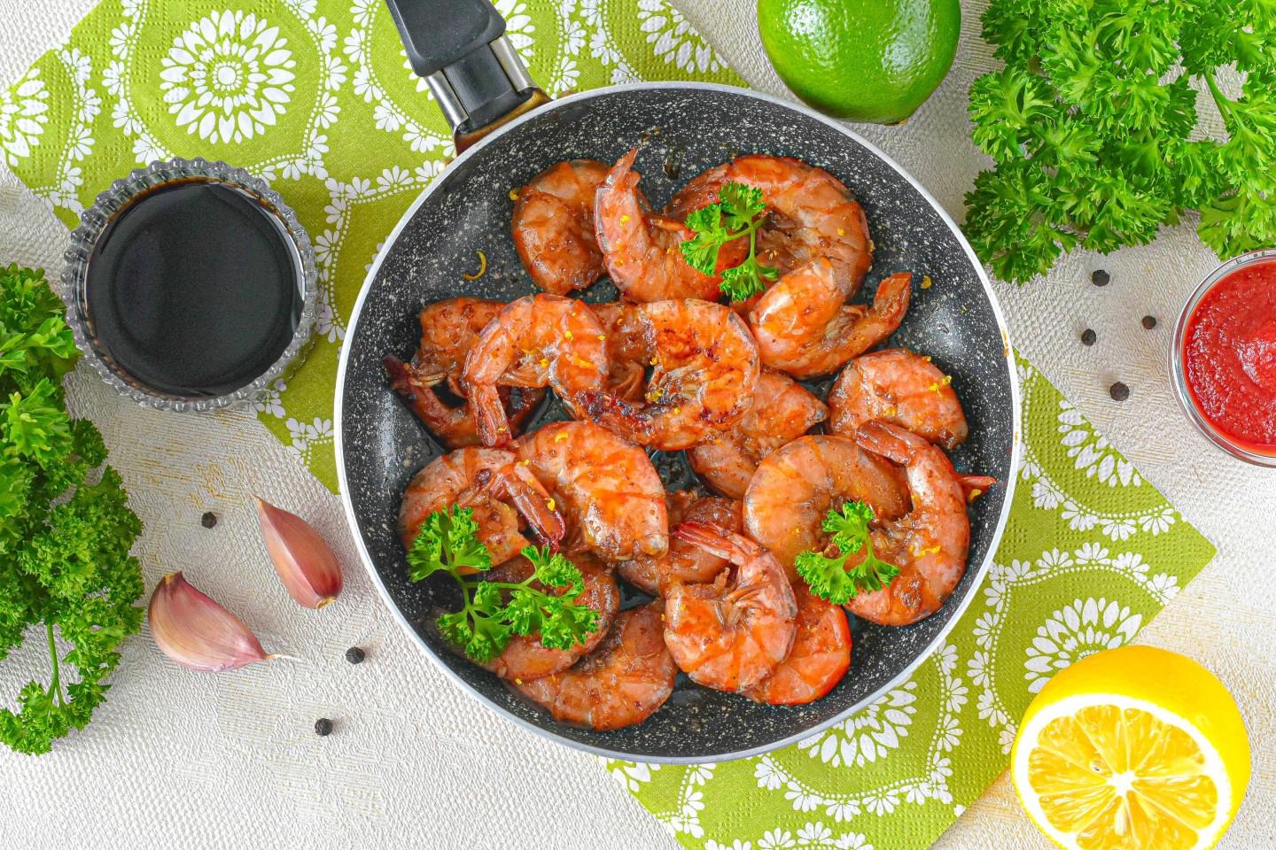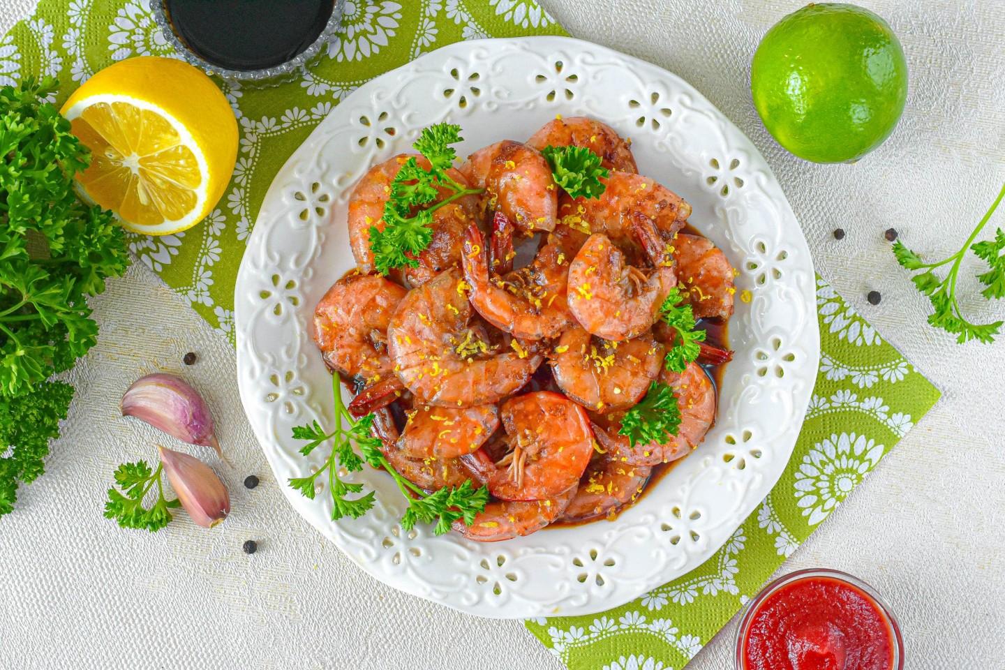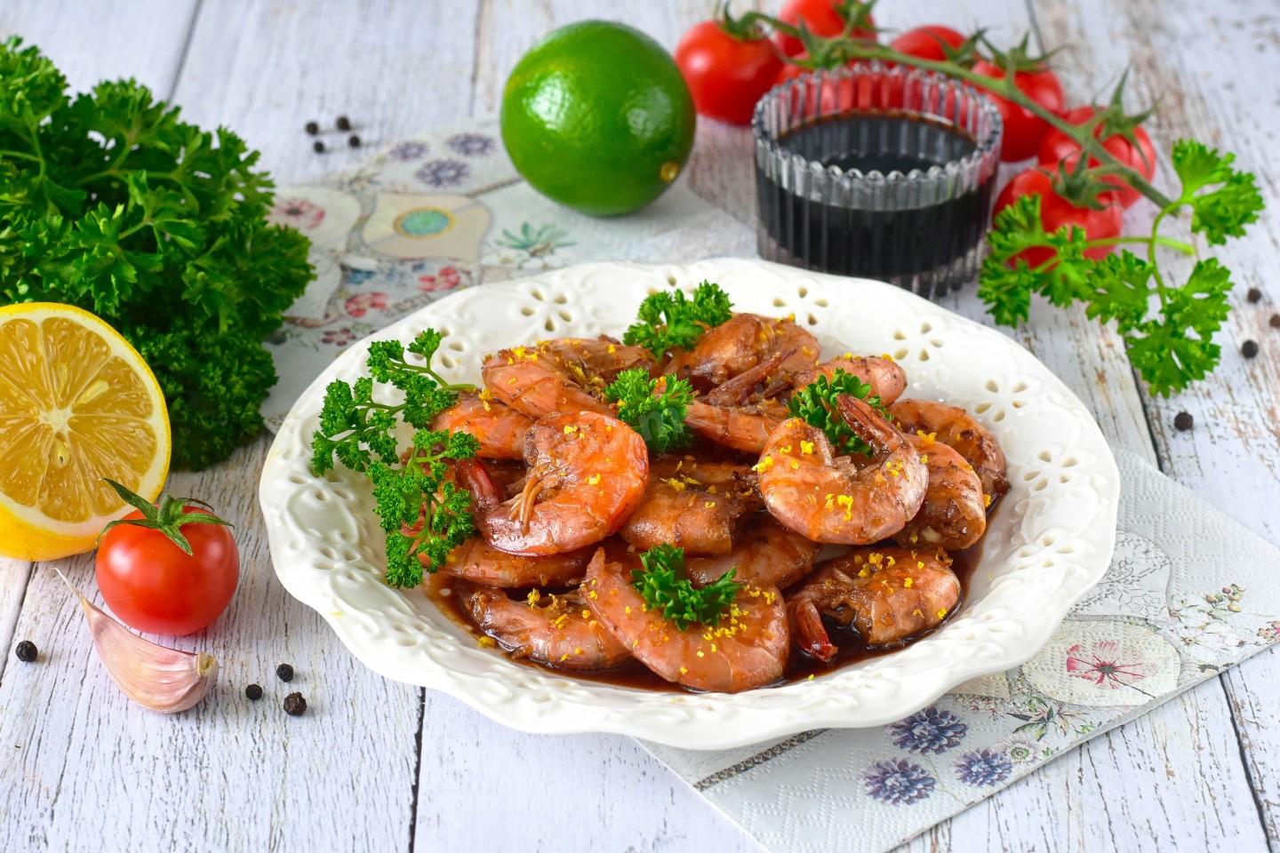 Жареные креветки в панцире в соевом соусе — это отличный источник легкоусвояемого белка и йода. Чеснок в составе укрепляет иммунитет, а лимонный сок богат витамином C. Использование соевого соуса позволяет контролировать количество соли, делая блюдо более полезным.