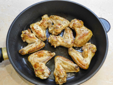 На сковороду для жарки налейте растительное масло и разогрейте её до горячего состояния. Выложите куриные крылышки и обжаривайте их до золотистого цвета с двух сторон. Чтобы крылышки стали покрываться именно золотистой корочкой, выкладывайте их в раскаленное масло. Как правильно выбрать сковороду и масло для жарки читайте в статьях на эти темы. Ссылки есть в конце рецепта.