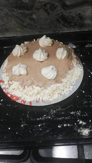 В отложенный для декора крем добавьте какао, хорошо размешайте. Декорируйте торт кремом, безе и орешками. Уберите торт в холодильник на пару часов.