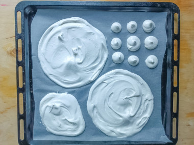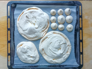 Противень застелите бумагой для выпечки. Из белка с арахисом на бумаге сформируйте 2 круглых коржа диаметром 20 см. Для этого можно приложить к бумаге тарелку нужного размера и обвести ее карандашом. Часть белка без орешков поместите в кондитерский мешок и выдавите украшение для торта, а другую выложите произвольной формы она пойдет на обсыпку. Выпекайте безе в духовке разогретой до 100°С около 90 мин. Время указано приблизительно.