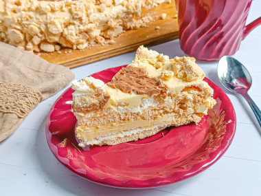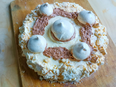 3 столовые ложки крема отложите для декора торта. Половину оставшегося крема выложите сверху на первый уже остывший корж, разровняйте силиконовой лопаткой. Выложите поверх второй корж и обмажьте торт сверху и с боков второй половиной крема. Безе для декора, которому придавали произвольную форму, измельчите в крошку, смешайте с отложенным порубленным арахисом и обсыпьте этой смесью бока торта.