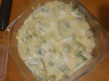 В форму для запекания выложите в обжаренное куриное филе, распределив её по всему дну формы. Поверх куриного филе выложите отваренную капусту.