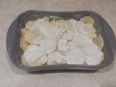 Картофель помойте, очистите и нарежьте на тонкие пластины. Если картофель молодой, то его достаточно помыть, а нарезать картофель можно вместе со шкуркой. Картофель выкложите слоями или гармошкой в форму, смазанную сливочным маслом.