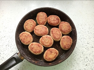 Котлеты панировала в цельнозерновой муке для большей пользы. Жарила на среднем огне, чтобы корочка хорошо схватилась. У меня котлет вышло много, на сковороде не пропаришь. Поэтому сложила их в стеклянную форму, налила пару ложек воды, накрыла крышкой и поставила в духовку на 20 минут при 200°С.