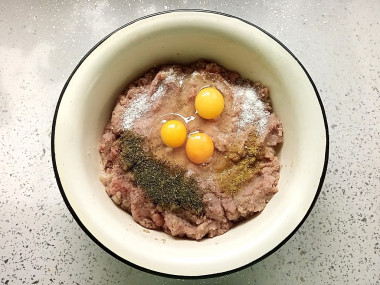 На 1 кг. фарша добавила три маленьких яйца и 200 г. белого батона, размоченного в молоке. Советую хорошо отжимать хлеб, чтобы фарш не стал слишком жидким. А если все-таки нужно загустить, то можно это сделать с помощью панировочных сухарей, овсянки или манки. Из специй у меня сушеный укроп и приправа для рыбы.